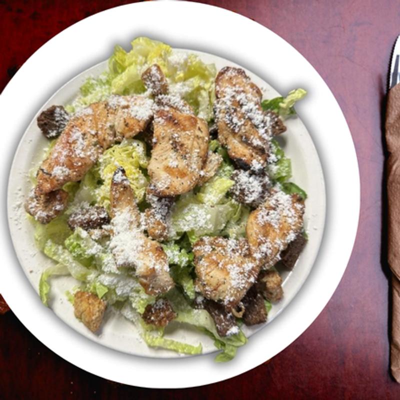 White Pizza • Grilled chicken, mozzarella cheese, topped with romaine lettuce drizzled with Caeser dressing.
